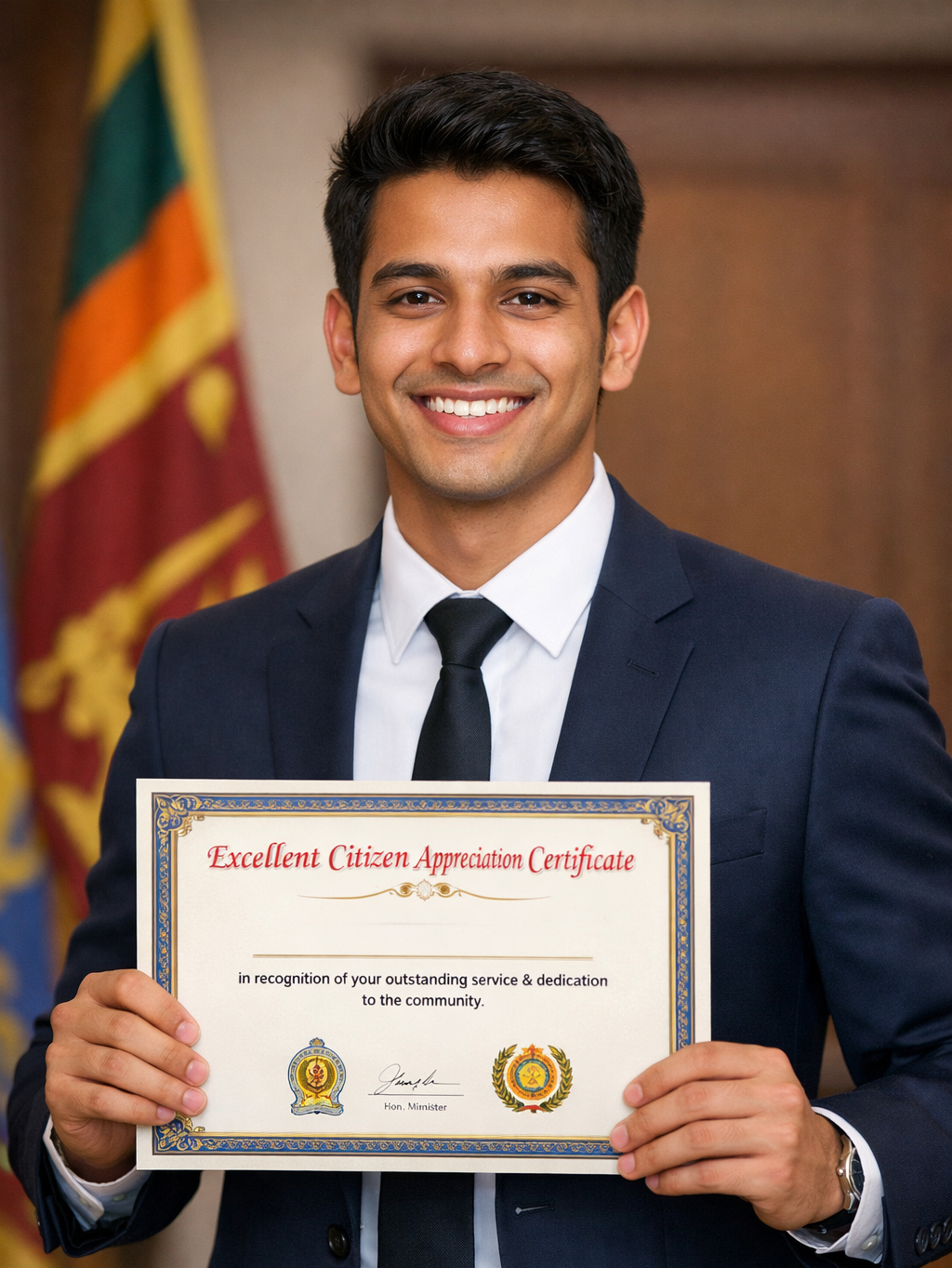 ආරක්ෂක අංශ,ස්වෙච්චා සංවිධාන,පූජක,සාමදාන විනිසුරු,ආදි තනතුරු හා වගකීම් දරන අය සදහා මෙම සහතිකය පිරිනැමේ. பாதுகாப்புப் படைகள், தன்னார்வ தொண்டு நிறுவனங்கள், மதகுருமார்கள் மற்றும் சமாதான நீதிபதிகள் போன்ற பொறுப்பான பதவிகளை வகிப்பவர்களுக்கு இந்த சான்றிதழ் வழங்கப்படுகிறது.This certificate is awarded to those who hold responsible positions such as security forces, voluntary organizations, clergy, and justices of the peace.